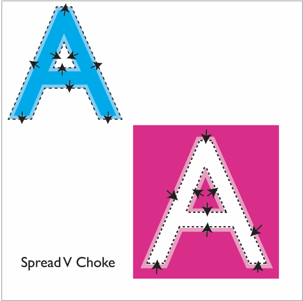 In a spread, the above object gets”knocked out” of the object below it, and the above color is extended out to cover the bottom color. In a choke, the above object gets “knocked out” of the object below it, and the background color is brought into the knocked-out area to ensure proper trapping.