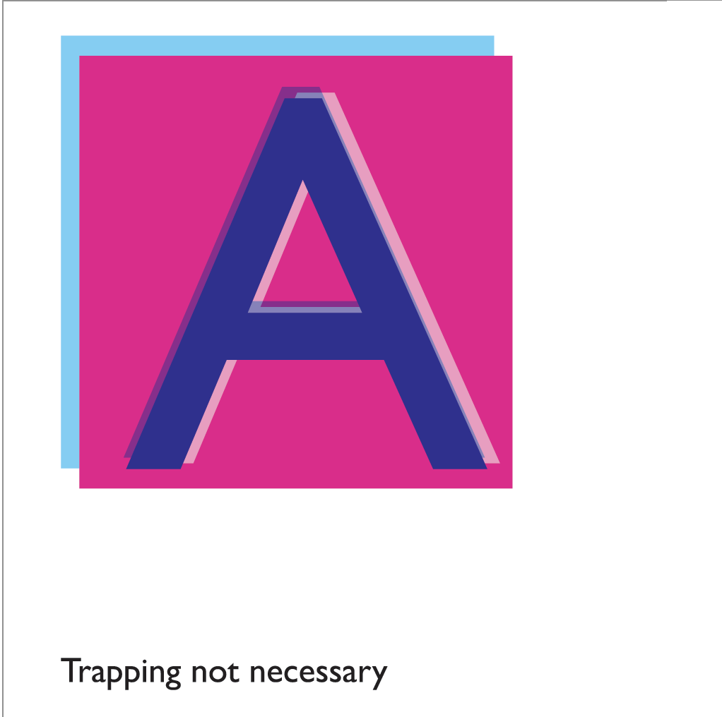 Trapping not NecessaryBy erin.pazour / March 3, 2025 A (un) intended third color is sometimes a resulting color from the overprinting of two colors; it can be the desired effect, as two inks overlap to create a third color. Trapping would prevent this.